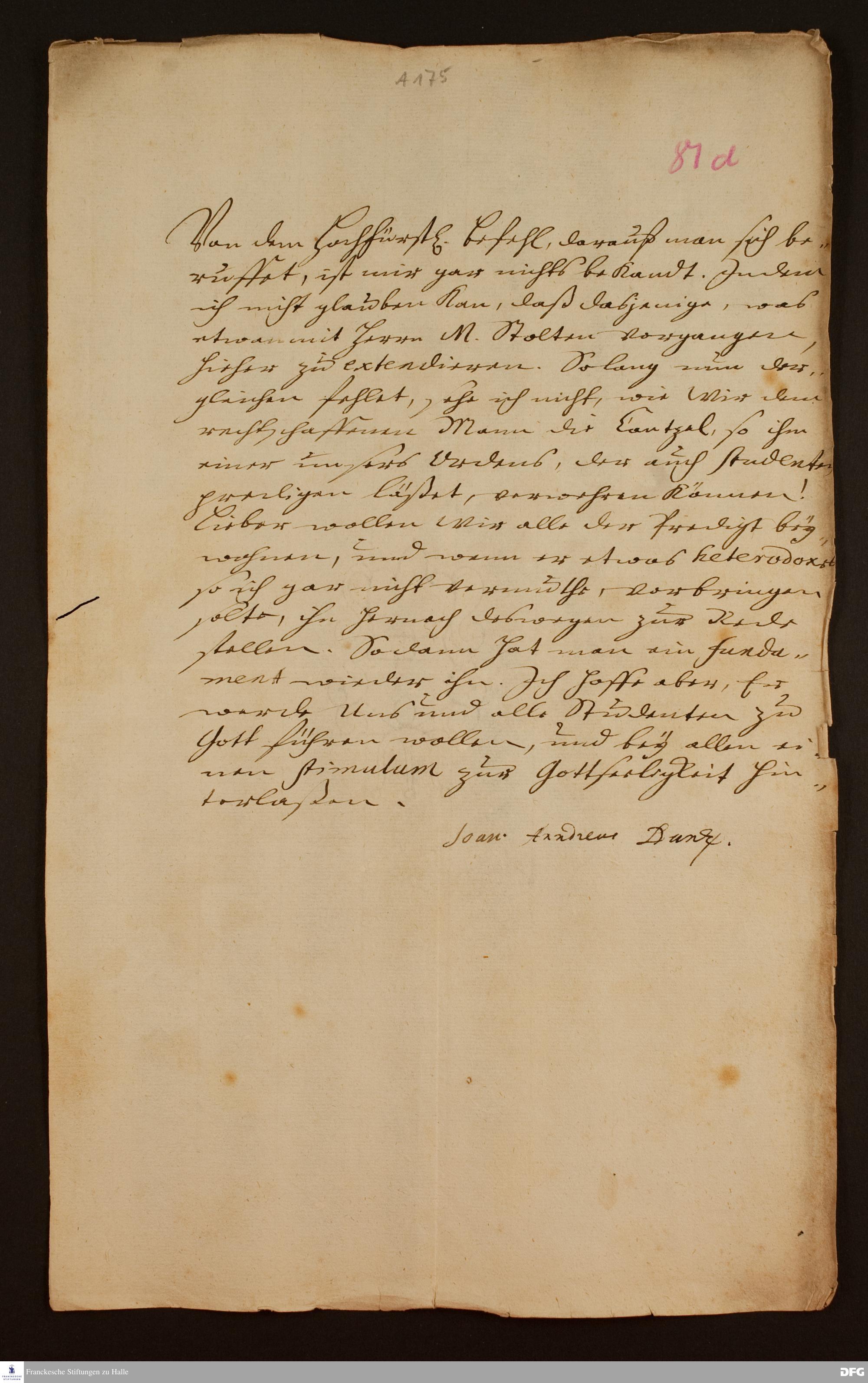Brief von Johann Andreas Danz an [Michael Förtsch] oder [Johann Franz Buddeus].