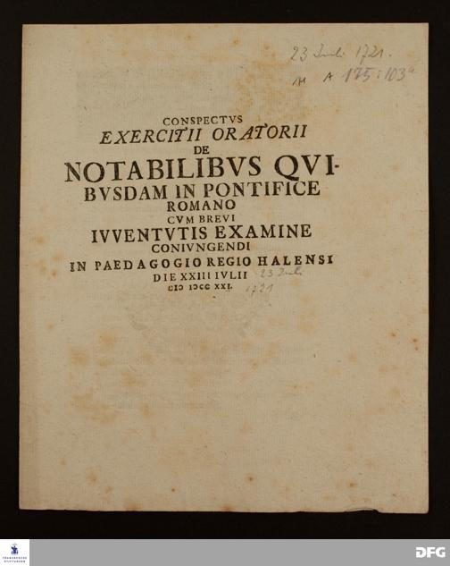Conspectus exercitii oratorii de notabilibus quibuscum in pontifice romano cum brevi juventutis examine conjungendi in Paedagogio Regio Halensi.