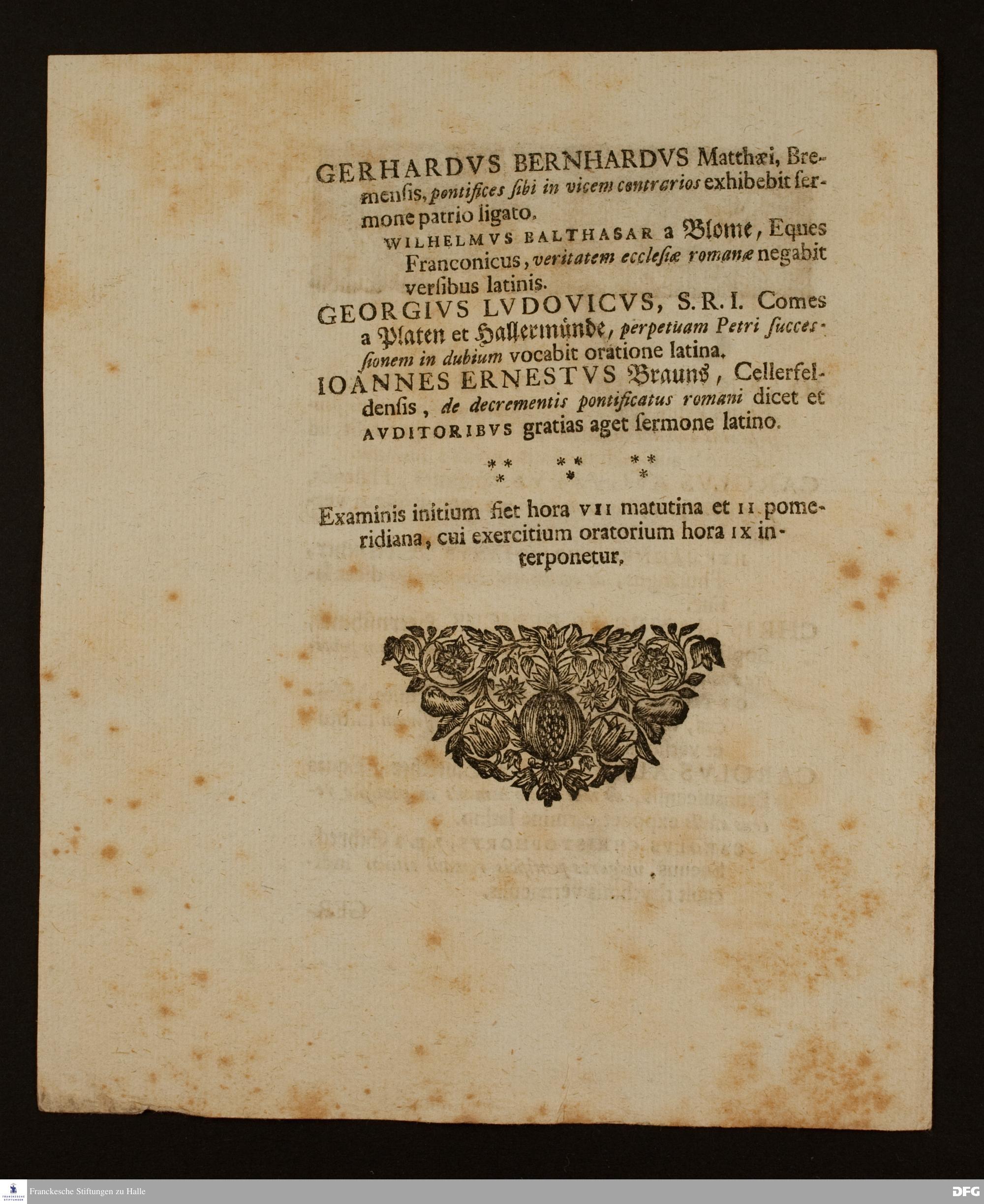 Conspectus exercitii oratorii de notabilibus quibuscum in pontifice romano cum brevi juventutis examine conjungendi in Paedagogio Regio Halensi.