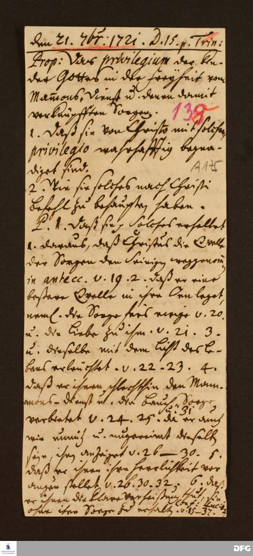 Disposition der Predigt von August Hermann Francke über Mt 6,24f. am 21.09.1721.
