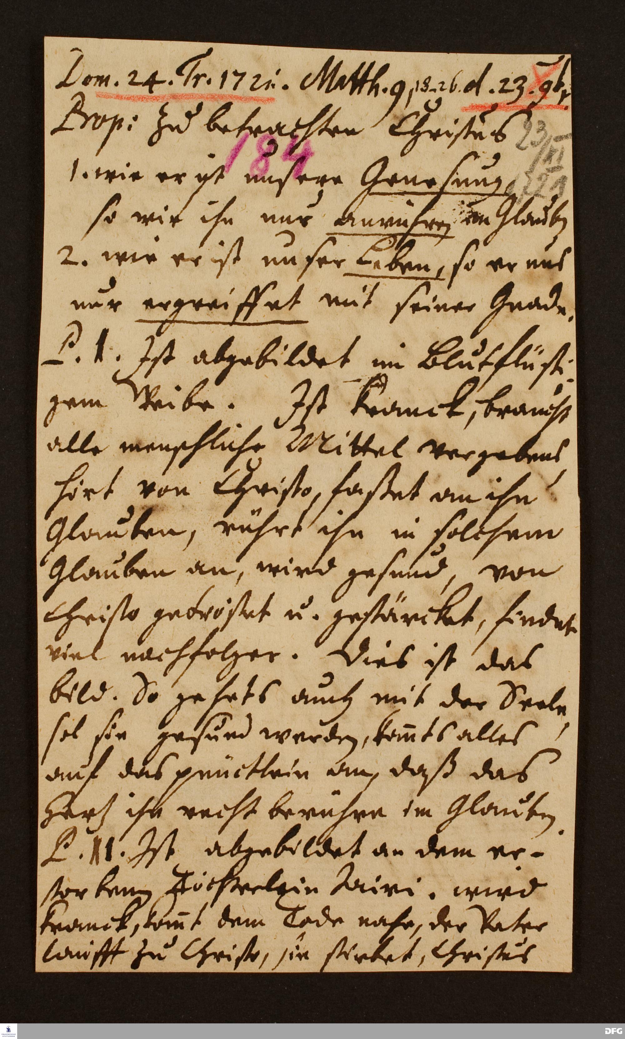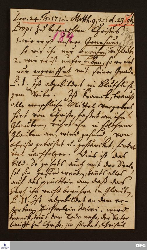 Disposition der Predigt von August Hermann Francke über Mt 9,18-26 am 23.11.1721.