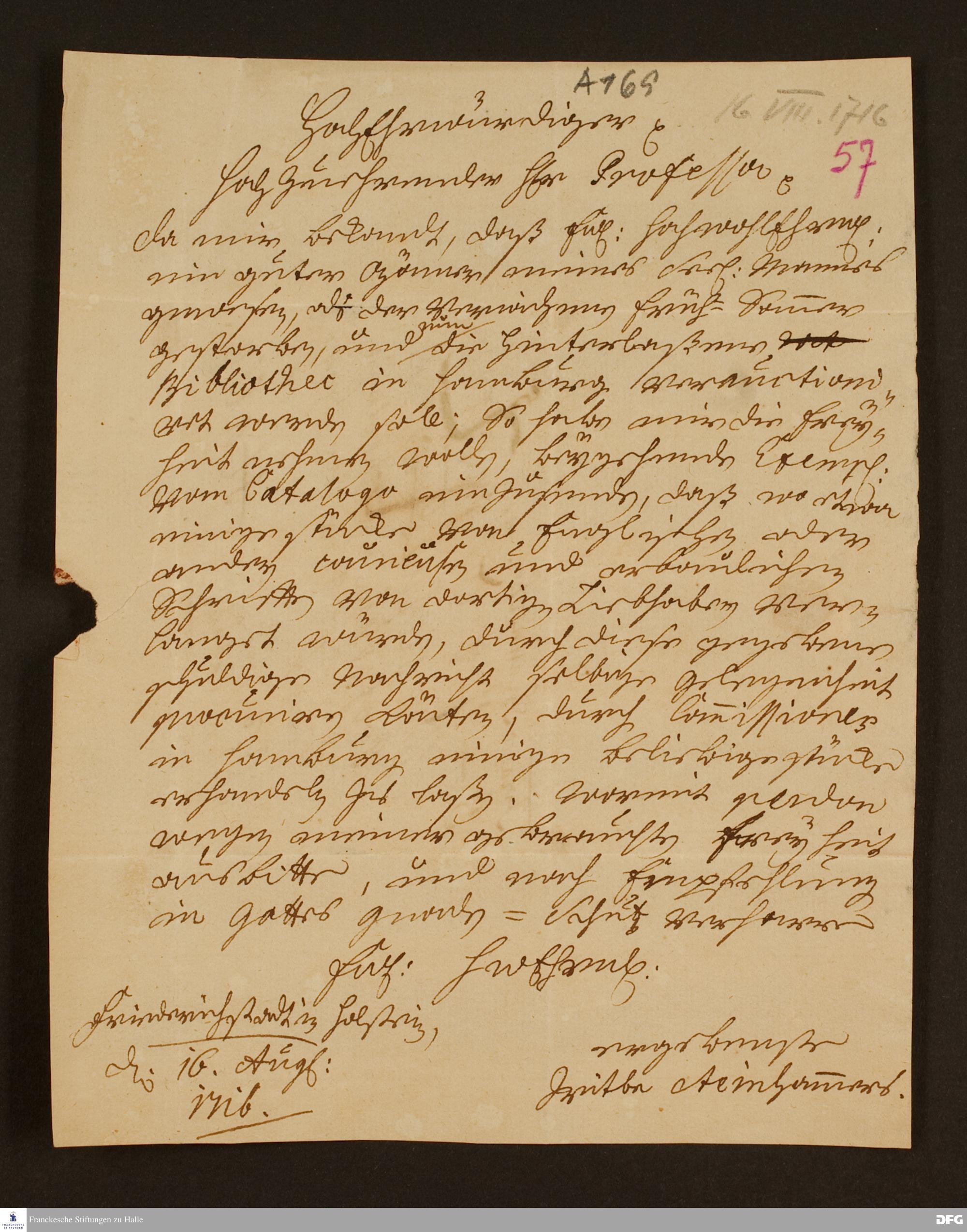 Brief der Witwe Steinhammer an August Hermann Francke.
