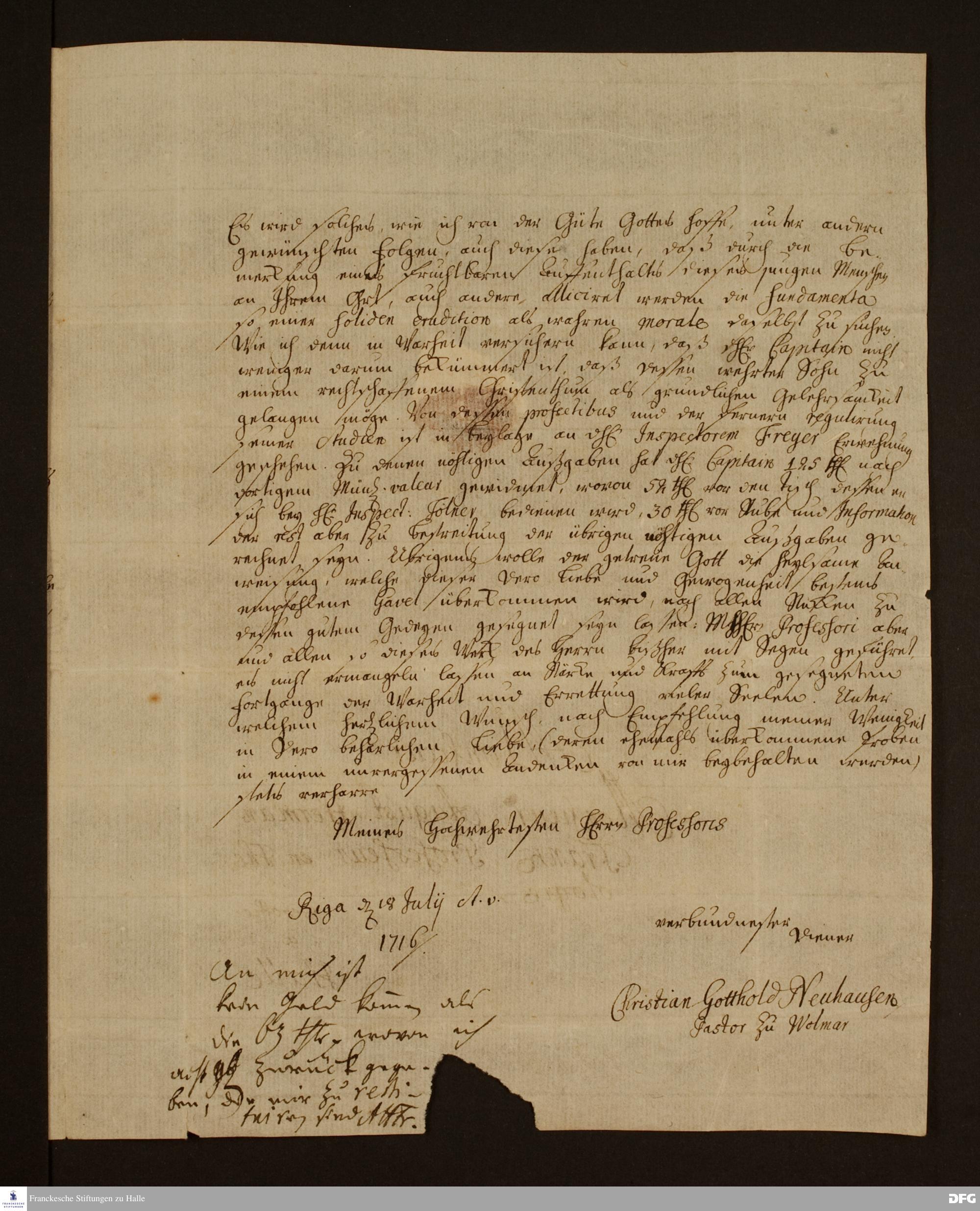 Brief von Christian Gotthold Neuhausen an August Hermann Francke.