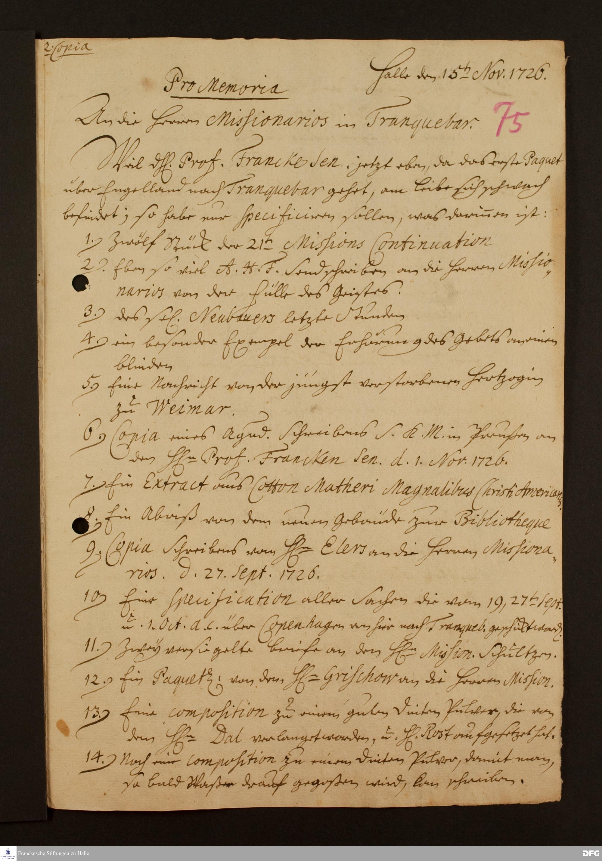 Promemoria von G[eorg] F[riedrich] W[eise] an Christian Friedrich Pressier, Martin Bosse und Christoph Theodosius Walther.