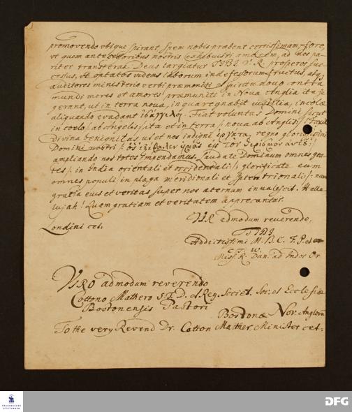 Brief von Christian Friedrich Pressier, Martin Bosse und Christoph Theodosius Walther an Cotton Mather.