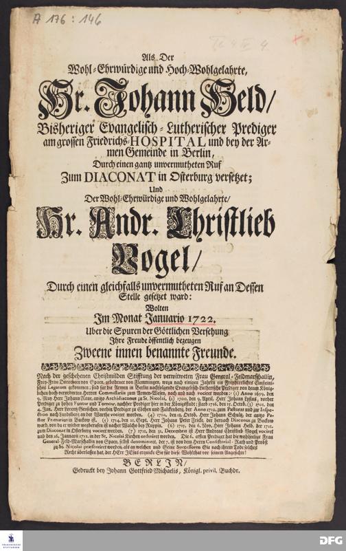 Segenswünsche von Christoph Matthäus Seidel und Jacob Baumgarten anlässlich der Berufung von Andreas Christlieb Vogel zum Prediger am Friedrichs-Hospital in Berlin.
