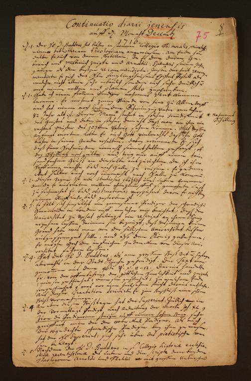 Verfasst in Ich-Form; Berichte über die Lehrveranstaltungen und Predigten von J. F. Buddeus, über das Auftreten von Professoren gegen die Pietisten sowie über das Verhalten von Studenten.